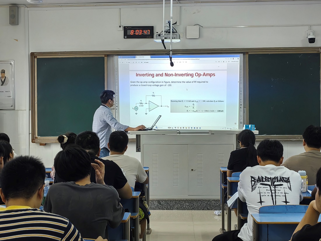 课堂上,Naguib老师以其独特的教学风格、地道的语言表达和丰富的案例互动,迅速吸引了全体学生的注意力。他围绕“Electronic Circuit”的核心知识点,通过启发式提问、小组讨论、情景模拟等多种教学方法,营造了活跃而富有成效的全英文学术氛围。同学们积极参与互动,大胆开口交流,课堂气氛热烈,展现了我院学子良好的专业素养和精神风貌。