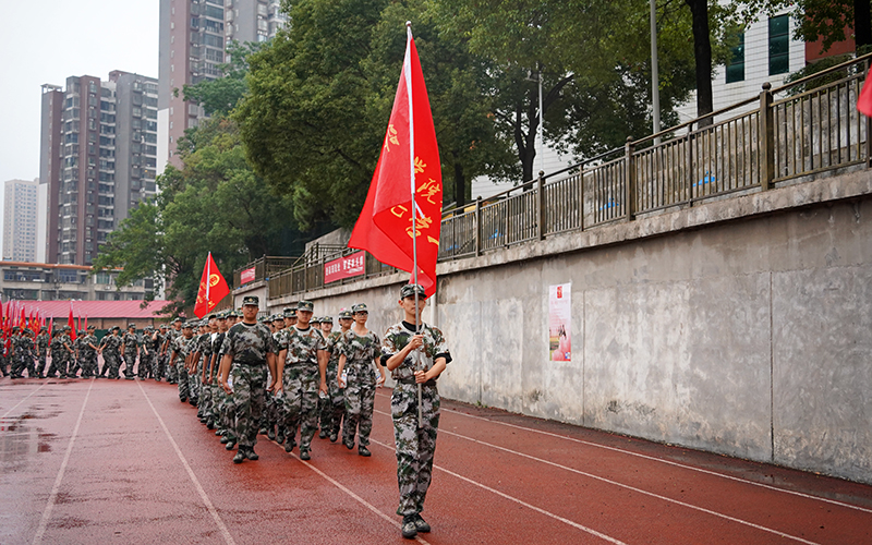 雨丝轻拂中,队伍如一条蜿蜒的绿色长龙行进在校园主干道上。新生们步伐坚定,口号声穿透雨幕,军歌在湿润的空气中激荡回响。雨滴打湿了迷彩服,却浇不灭青春的斗志。个别同学体力不支,在同伴鼓励和教官、辅导员的全程守护与后勤保障下,大家相互鼓励、坚持前行。经过2个小时的跋涉,全员抵达目的地体育新城。