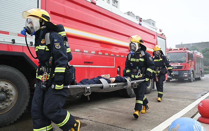 15时整,随着急促的警报声骤然响起,浓烟在演练楼栋的楼层间模拟升腾。新生们迅速用湿毛巾捂住口鼻,弯腰低姿,在辅导员的引导下,沿着疏散通道有序撤离。脚步声、指令声、警报声交织,队伍快速而井然,短短几分钟内,全体人员安全抵达指定集合区域。与此同时,消防官兵迅速介入。在演练现场,消防队员接驳水管扑灭“火源”,云梯车升空展开高空救援,破拆组模拟搜救被困人员,并将“伤员”从“火场”救出并送往“救治”。