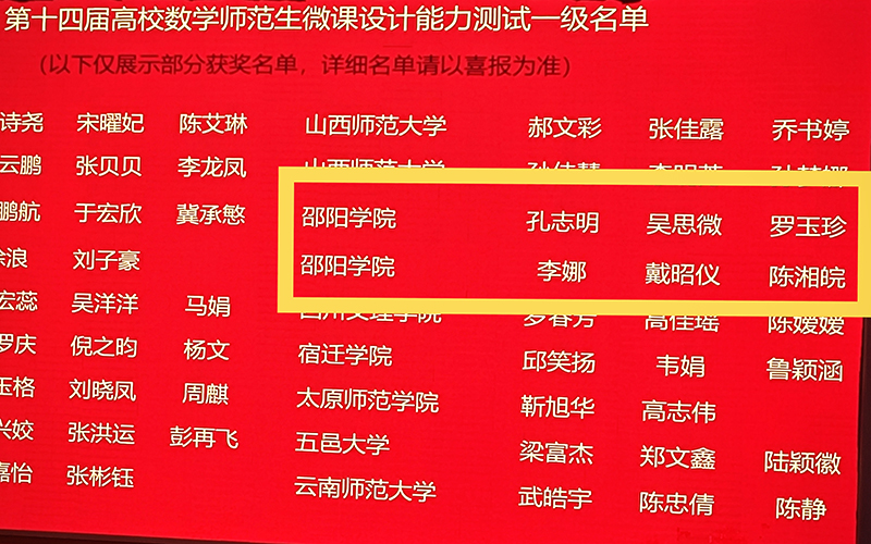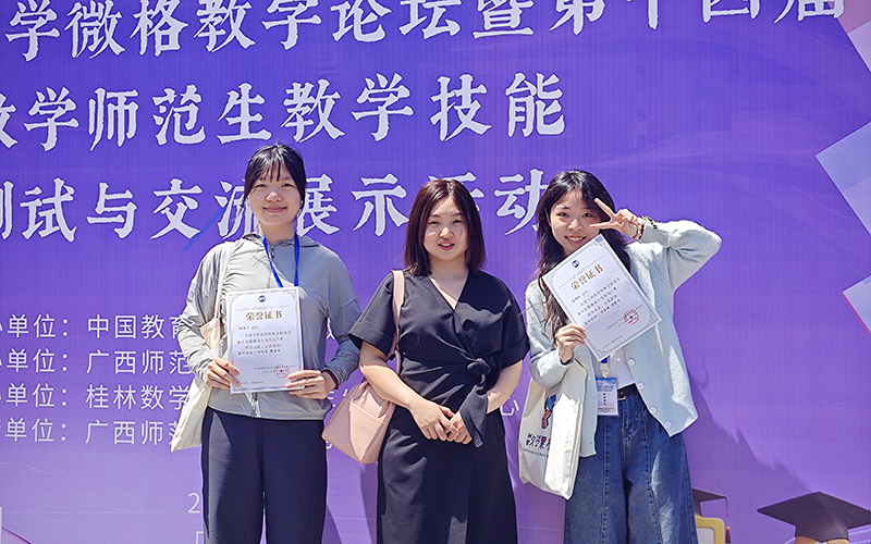 5月9日至5月12日,第十四届高校数学师范生教学技能竞赛在广西师范大学圆满结束。在经过激烈的竞争之后,开云官网微课赛道3组进入决赛,微格赛道2位选手进入决赛,荣获微课赛道一等奖2组,二等奖1组;微格赛道一等奖1人,二等奖1人,以及优秀组织奖。