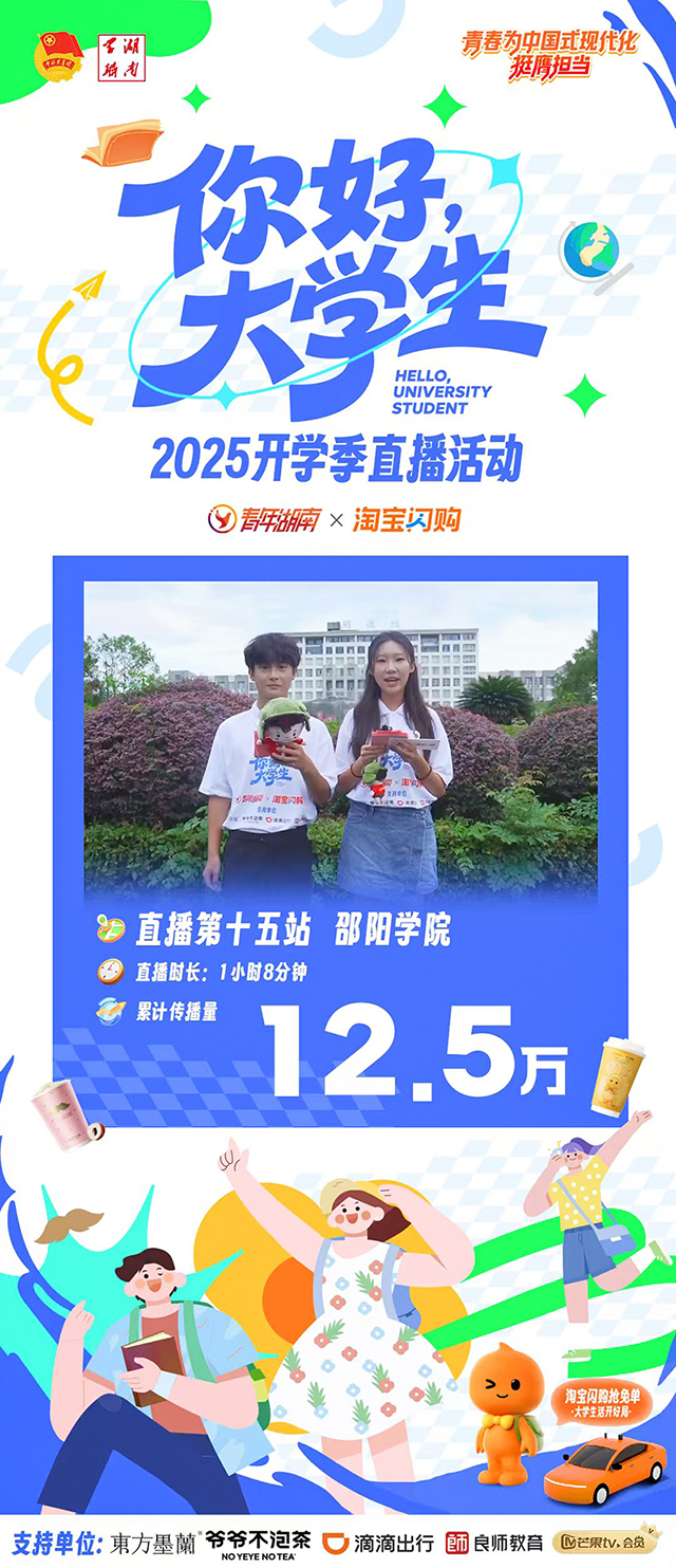 据悉,本次活动由共青团湖南省委、湖南省学生联合会指导,共青团湖南省委宣传部、学校部主办。直播在“青年湖南”抖音、视频号、微博、快手,“湖南共青团”B站,人民日报视频客户端“视界”同步播出。整场直播持续一个多小时,累计传播量突破12.5万,为新生提前熟悉校园、融入大学生活提供了便捷高效的渠道。